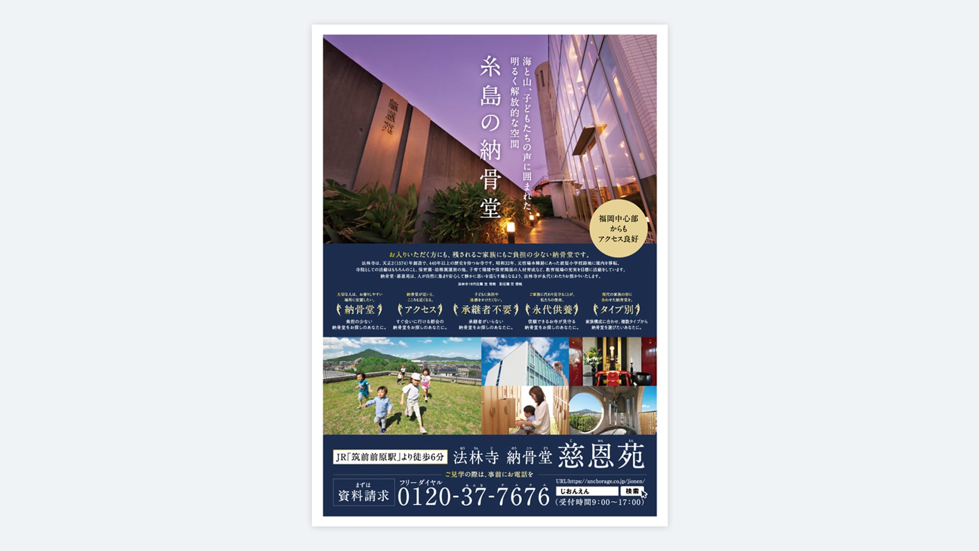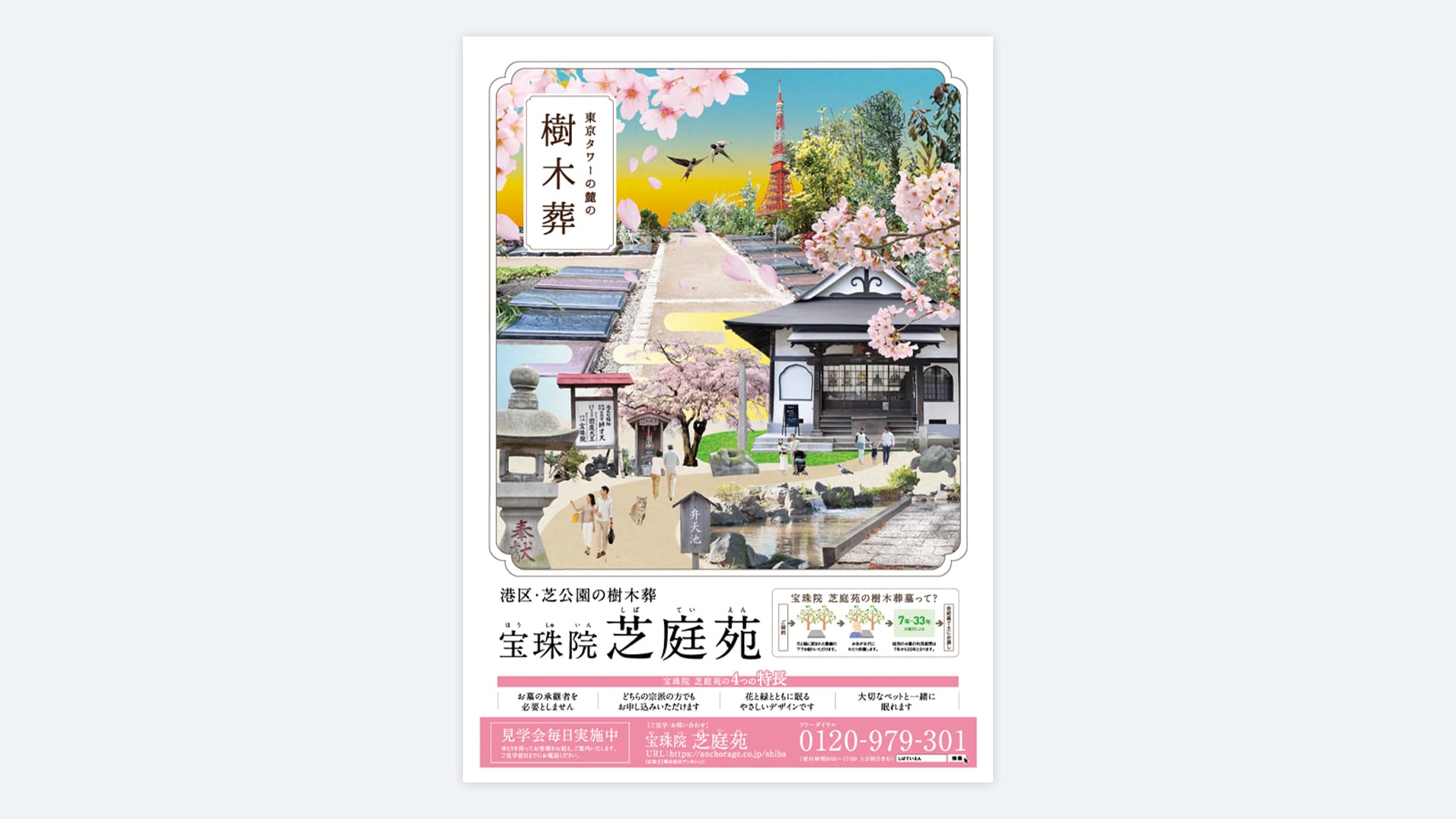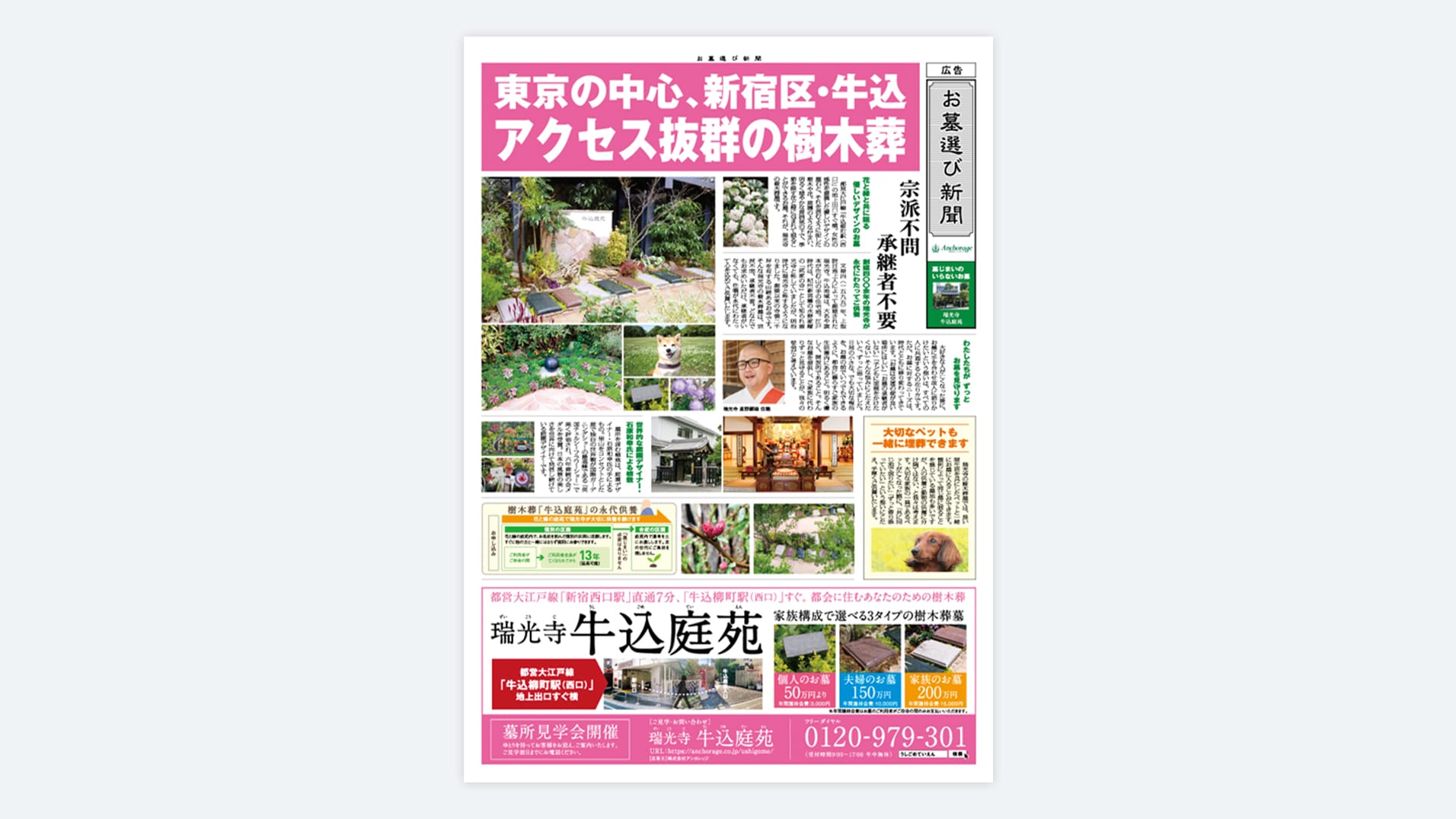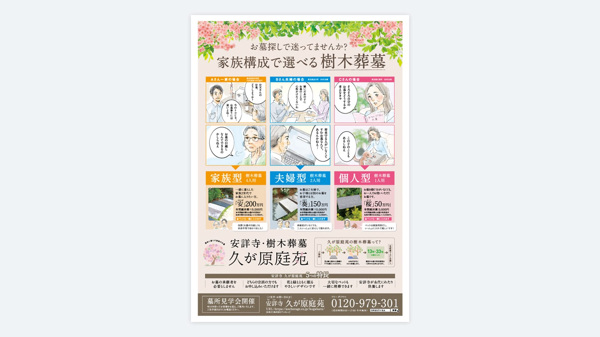 花と緑に囲まれた永代供養墓(樹木葬)の折込チラシです。マンガや新聞風にするなど永代供養墓の特長がわかりやすい紙面にしています。女性向けに優しいデザインを目指しています。