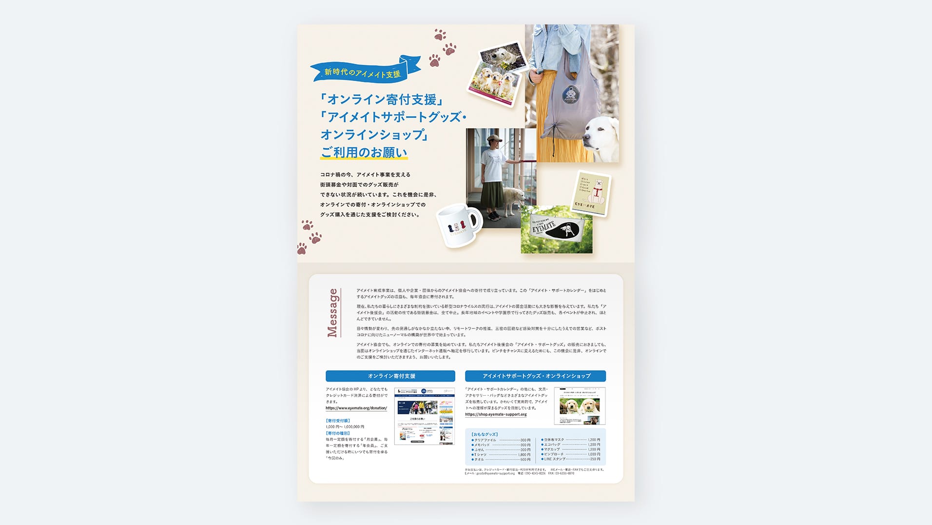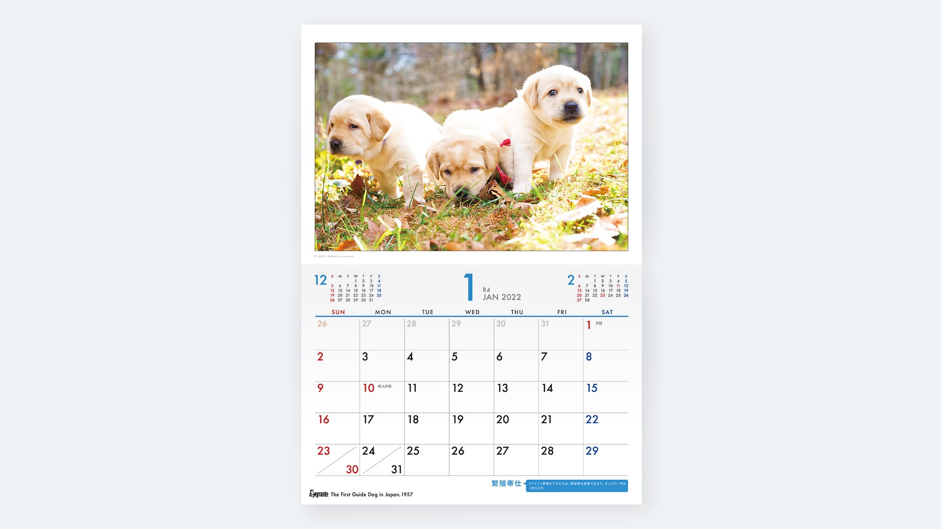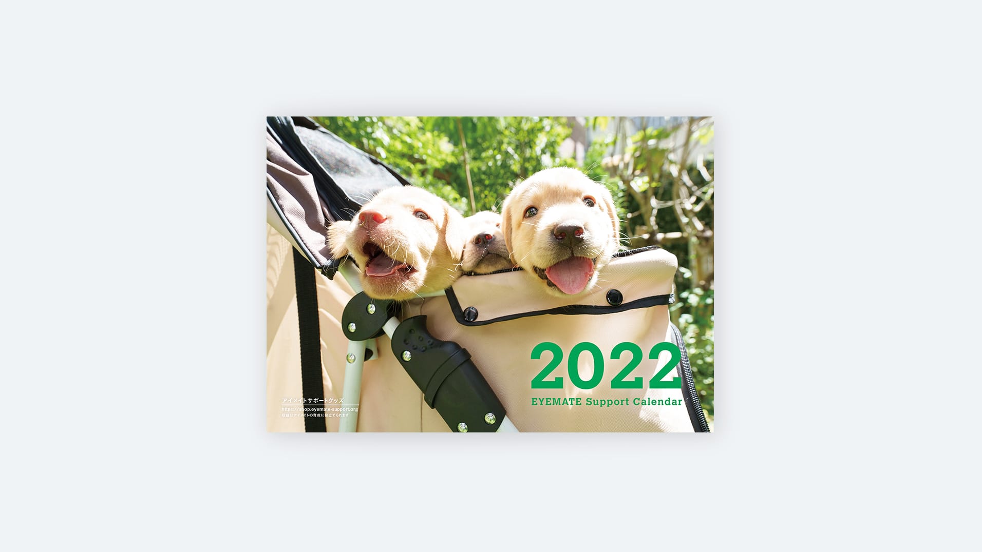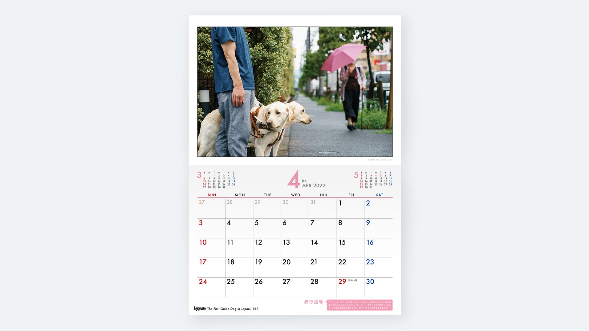 アイメイトと人々が過ごす12カ月をカレンダーにしたチャリティグッズ。写真家によるいきいきとした写真を活かす、シンプルで親しみやすいデザインにしています。巻末特集は柔らかくあたたかみのある雰囲気で、メッセージを丁寧に伝えます。