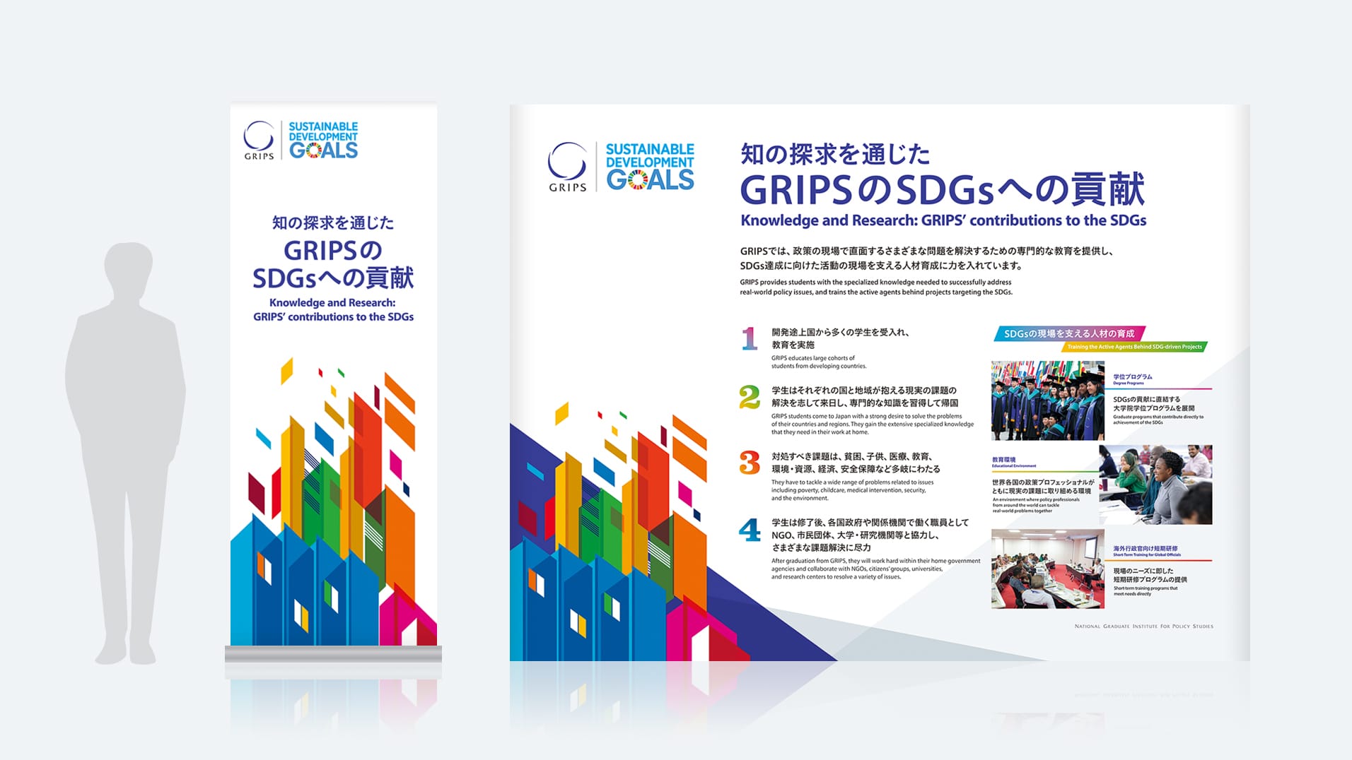大学から世界へ発信していく様子をSDGsのカラフルなカラーで表現したメインビジュアルを制作。パンフレットやWebサイトの他、イベント用のスタンドバナーやバックパネルなどに展開しています。